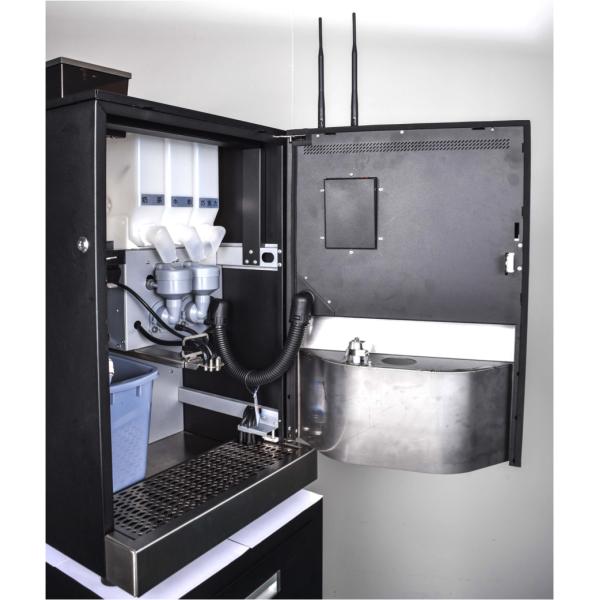 INGES4C-00 The machine is mainly composed of a coffee bean grinder, a coffee brewer, a coffee bean box, three material boxes, two mixers, a coffee residue box, a dripping box, hot water system, beverage outlet, control system (IO + touch screen), machine shell, door and other related modules. It can choose to configure fresh milk system.