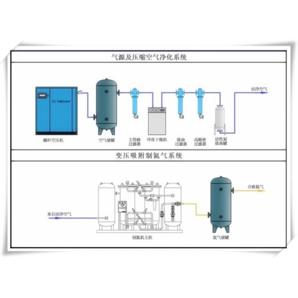 (1) Inlet air:The air compressor press the air into transporting pipe,then use the compressed air clarification system to remove the water,oil,dust and so on,reach to air buffer tank,then pass through air buffer tank into two adsorption tower.